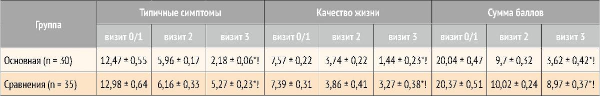 На втором визите в обеих группах отмечено статистически значимое снижение как баллов, отражающих выраженность типичных симптомов по шкале ACSS, так и качества жизни, соответственно, в 2 раза снизилась сумма баллов как в ОГ, так и в ГС. Однако если в течение последующих 2 нед. скудная симптоматика в ГС практически не изменилась (р > 0,05), то у пациенток, получавших БАД Цистениум II, сумма баллов продолжала уменьшаться, достигнув в среднем 3,62 ± 0,42, что в 5,5 раза меньше исходного и почти в 3 раза меньше суммы баллов по окончании антибактериальной терапии (р < 0,05). Сравнительная динамика выраженности симптомов представлена в табл. 1.