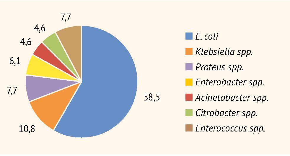 По завершении антибактериальной терапии уменьшение числа лейкоцитов в моче ниже диагностического предела (10 клеток в поле зрения) было достигнуто у всех пациенток в обеих группах, в среднем лейкоцитурия в ГС составила 8,7 ± 0,2 и в ОГ - 8,2 ± 0,4, р > 0,05. Через 2 нед. отмечено статистически значимое превосходство ОГ по этому параметру: лейкоцитурия в ГС снизилась до 7,1 ± 0,5 (р > 0,05), а в группе пациенток, получавших Цистениум II, - до 4,2 ± 0,4 (р < 0,05). Исходный спектр уропатогенов представлен на рисунке.
