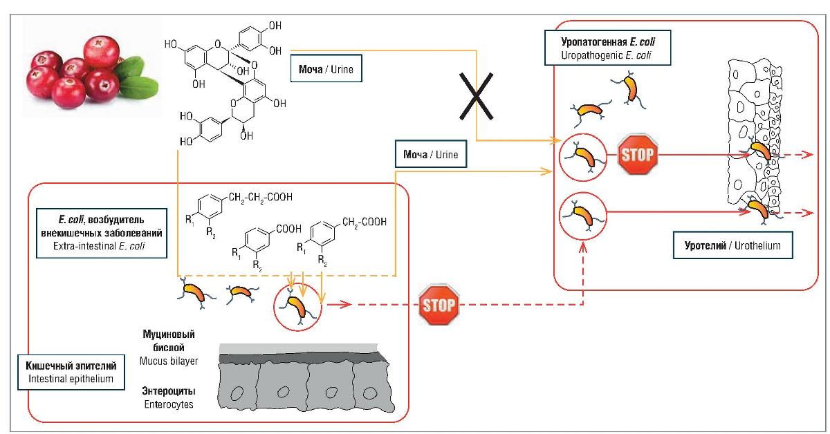 Последние годы особое внимание уделяется влиянию на кишечную микробиоту организма проантоцианидинов типа А и их метаболитов, модулирующих ее состав и предотвращающих дисбактериоз [30]. Способность клюквы модулировать микробиоту кишечника основывается на ослаблении влияния животной диеты на ее состав [56]. Исследования in vitro показали, что флавоноиды и фенольные кислоты клюквы могут взаимодействовать с внекишечной E. coli (ExPEC) и уменьшать ее (транзиторную) кишечную колонизацию, а следовательно, снижать риск возникновения ИМП. Потенциальные механизмы действия полифенолов клюквы против ИМП представлены на рисунке [30].
