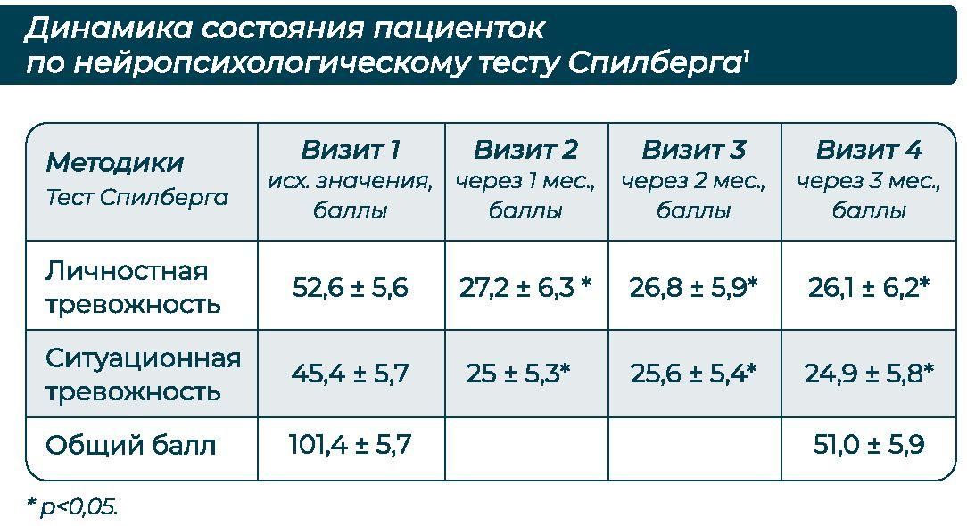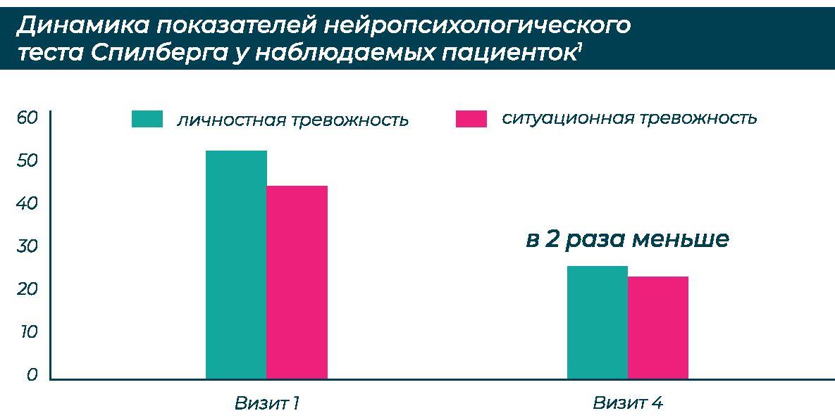 На начало исследования результат теста Спилберга составлял более 100 баллов, что говорит о выраженной личной и ситуационной тревожности пациенток. Через 3 месяца приема Менсе показатели тревожности уменьшились в 2 раза - до низкой степени тревожности.