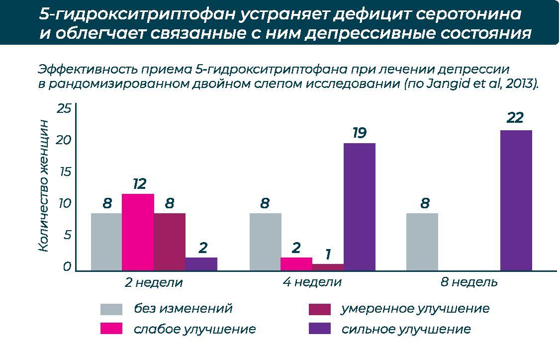У 22 пациентов из 30, принимавших 5-гидрокситриптофан на протяжении 8 недель, наблюдалось значительное улучшение состояния при эпизоде депрессии.2 Для оценки тяжести депрессии на исходном уровне применялась шкала депрессии Гамильтона.