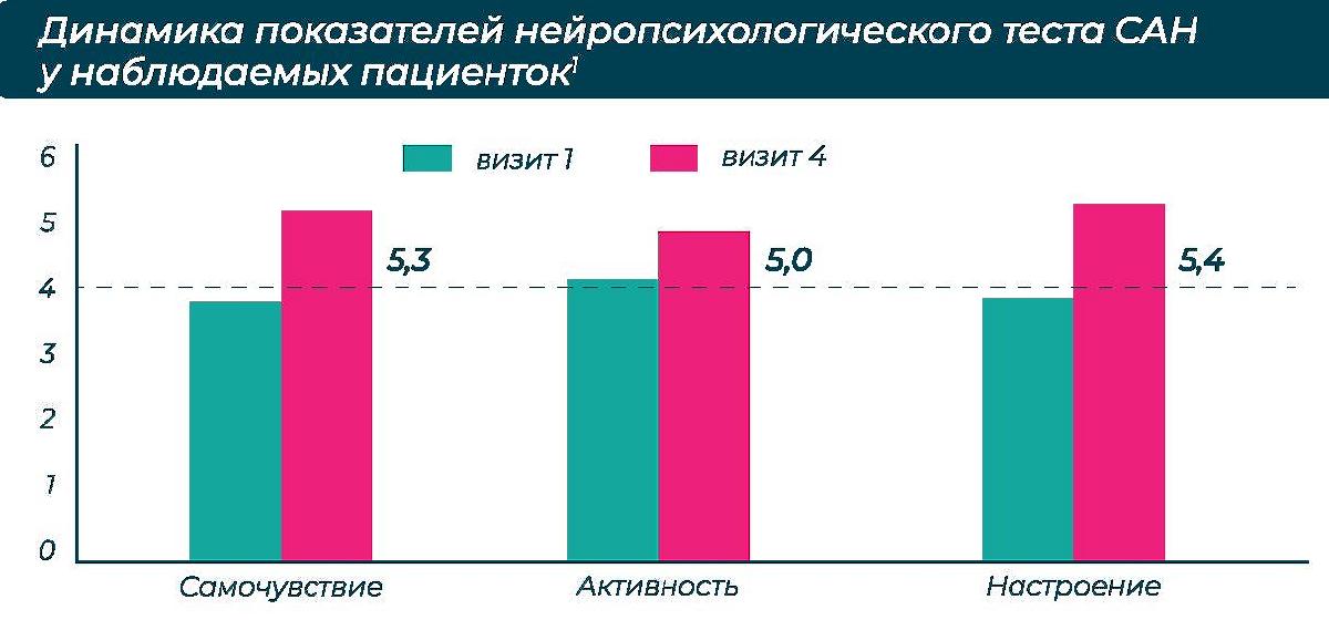 До приема Менсе средняя оценка самочувствия женщин составила менее 4 баллов. Через 3 месяца все параметры - самочувствие, активность и настроение-достигли 5 и более баллов, что говорит о благоприятном воздействие Менсе на психоэмоциональный статус.