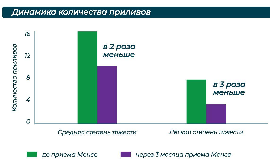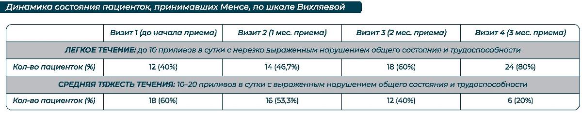 В 40 % случаев за 3 месяца приема Менсе тяжесть климактерического синдрома перешла из средней в легкую.
