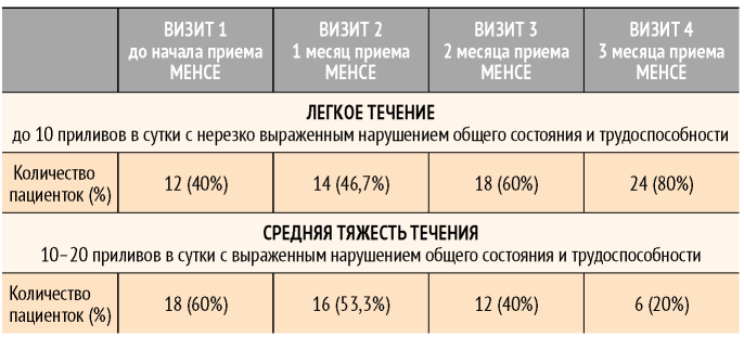 По итогам приема МЕНСЕ при проведении субъективной оценки пациентками результатов приема получены следующие результаты: более половины пациенток - 17 (56,6%) отметили значительное улучшение; 12 (40%) пациенток отметили некоторое улучшение; отсутствие улучшения отметила 1 (3,3%) пациентка. Ухудшение не было отмечено ни одной из пациенток.
