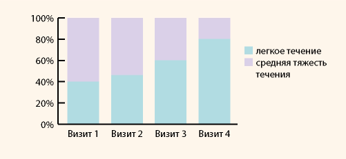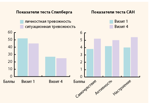 Несмотря на то что клинически значимая динамика индексов Купермана и Вихляевой определялась только после второго месяца приема МЕНСЕ, при субъективной оценке динамики состояния значительное улучшение состояния на втором визите (после 1 мес. применения) отметили 12 (40%) пациенток, что, вероятнее всего, объясняется более быстрой положительной динамикой состояния по нейропсихологической шкале Спилберга. Статистически значимое снижение уровня личностной и ситуационной тревожности по тесту Спилберга и переход в категорию низкого уровня тревожности отмечены уже на втором визите.