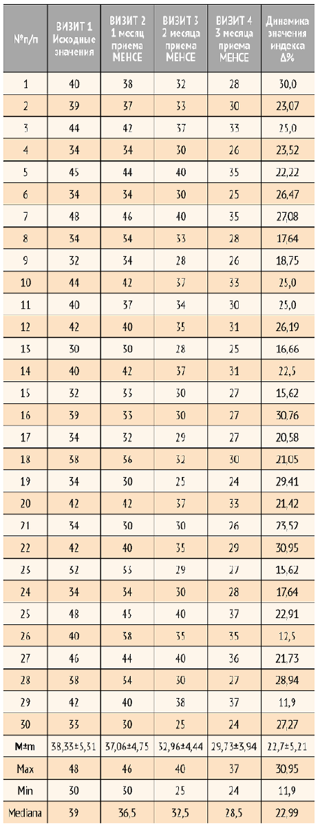 Итоговое изменение индекса Купермана в дельтапроцентах колебалось от 12 до 31 △%. Клинически значимое изменение индекса Купермана - 14,0 △% отмечено на третьем визите, после двух месяцев применения МЕНСЕ.