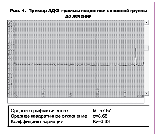 Параметры микроциркуляции (ПМ), регистрируемые при лазерной допплеровской флоуметрии (ЛДФ), зависят от скорости движения эритроцитов в зондируемом объеме ткани. Определяя скорость движения эритроцитов по сосудам, можно определить и оценить их концентрацию и распределение в исследуемых тканях. Запись ЛДФ-граммы производится в режиме наблюдения (не менее 2—3 минут), при этом регистрируется среднестатистическое значение ПМ (характеризует поток эритроцитов в единицу времени через единицу объема ткани, измеряемых в перфузионных единицах (перф. ед.)). Колебания кровотока в тканях называются осцилляциями или флаксмоциями (flux motion); они являются основными показателями жизнедеятельности тканей и отражают изменчивость гемодинамики в зависимости от постоянно меняющихся условий и потребностей тканей в перфузии их кровью. Эту изменчивость и отражает ЛДФ-грамма в виде важной характеристики потока эритроцитов — о или среднеквадратическое отклонение (СКО) статистически значимых колебаний скорости эритроцитов. Соотношение перфузии ткани и величины ее изменчивости (СКО) характеризуется коэффициентом вариации Kv (Kv= 8/ПМх100%). Чем выше Kv, тем лучше выражена вазомоторная активность микрососудов [28].