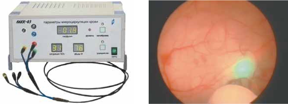 При проведении исследования использован лазерный анализатор микроциркуляции крови ЛАКК-02 (НПП «ЛАЗМА», Россия), состоящий из двух излучателей для зондирования ткани в видимой красной области спектра излучения и в инфракрасной области, фотоприемного устройства и световодных зондов-датчиков, сконструированных для работы в жидкой среде (рис. 1). В качестве излучателя используется гелий-неоновый лазер типа ЛГН-207Б или ЛГН-208Б с длиной волны 0,63 мкм. Мощность лазерного излучения на входе светового кабеля составляет не менее 0,5 мВт [27].
