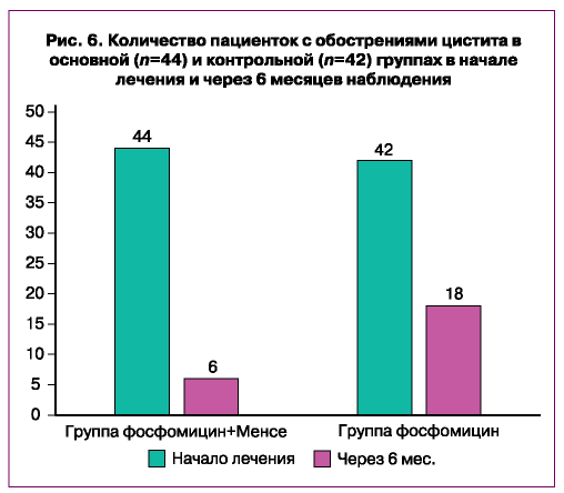 Что касается основной группы (n=44), получавшей после купирования цистита БАД «Менсе», рецидив хронического цистита в течение 1 месяца после лечения выявлен у 4/44 (9,1%) женщин и еще лишь у 2/44 (4,5%) пациенток в течение 6 месяцев после терапии, у 4/44 (9,1%) пациенток выявлена бессимптомная бактериурия. Следует отметить, что признаки обострения цистита диагностированы у 6/44 (13,6%) пациенток основной группы за все время наблюдения (рис. 6).
