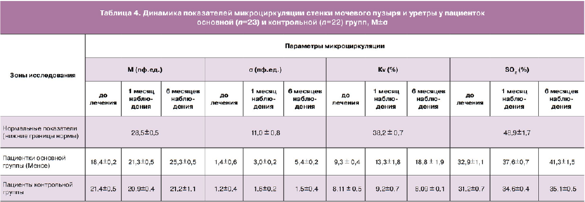 Результаты: В ходе проведенного исследования все пациентки основной группы отмечали значительное улучшение общего самочувствия, уменьшение тяжести, боли внизу живота и дискомфорта в области уретры во время визитов через 1 и 6 месяцев. Применение БАД «Менсе» у женщин с хроническим рецидивирующим циститом на фоне пери- и постменопаузы позволяет добиться большего клинического эффекта за счет выраженного улучшения микроциркуляции в стенке мочевого пузыря и уретры и положительной динамики в отношении тазового венозного кровотока.