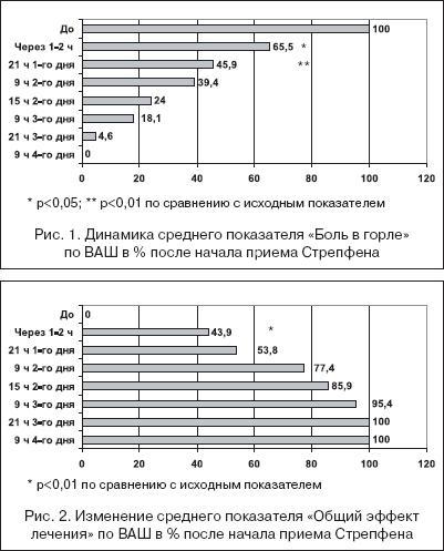 К концу 3–х суток все больные оценили эффект от проводимого лечения как 100%-ный. В процессе лечения ни в одном случае не было зарегистрировано нежелательного действия Стрепфена. Поэтому переносимость препарата можно оценить как хорошую. Полученные нами результаты совпадают с данными других авторов. Особенно важно, что имеются подтверждения быстрого уменьшения болезненности при глотании. Препарат более наглядно демонстрирует процесс уменьшения воспаления, поскольку обеспечивает стихание болезненных проявлений не только в поверхностных, но и в глубоких слоях слизистой глотки. В заключение отметим, что фарминдустрия предлагает много средств для лечения болей в горле – от растительных до лекарственных с добавлением либо антисептического, либо противомикробного, либо местноанестезирующего компонентов. По нашему мнению, лечение, направленное на подавление воспалительной реакции в ротоглотке, может быть эффективным только с помощью НПВП, действующих на ключевое звено поддержания этой реакции. Вместе с тем, определенная осторожность должна быть проявлена при назначении флурбипрофена (даже местно) больным с язвенным анамнезом, бронхиальной астмой, гемофилией, у пожилых пациентов, а также при неязвенной диспепсии, поскольку некоторая часть препарата может проглатываться и оказывать действие непосредственно в органах пищеварения. Вследствие отсутствия данных по безопасности не рекомендуется применять Стрепфен у детей. Таким образом, Стрепфен – препарат направленного (местного) противовоспалительного действия – демонстрирует высокую клиническую эффективность, хорошую переносимость и может быть использован для лечения острого вирусного тонзиллофарингита.