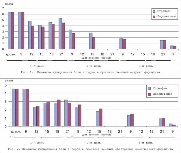 Однако, как свидетельствуют результаты исследования, наглядно представленные на рисунке 2, при применении Стрепфена и парацетамола происходит значительное снижение болевого синдрома у пациентов с обострением хронического фарингита .