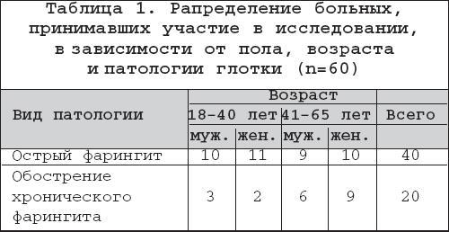 Нами было проведено клиническое наблюдение за 60 больными в возрасте от 18 до 65 лет, страдающими воспалительной патологией глотки, сопровождающейся болями в горле. Поло–возрастная характеристика больных, принявших участие в исследовании, приведена в таблице 1. Все больные, включенные в исследование в соответствии с требованиями протокола и стандартами «Качественной клинической практики», методом рандомизации были разделены на две группы. Пациенты основной группы (n=30) принимали Стрепфен (8,75 мг х 5 раз/сут.), пациентам контрольной группы (n=30) проводилась терапия парацетамолом (500–1000 мг 3–4 раза/сут., не более 3000 мг/сут.). Интенсивность и динамику боли в горле, фарингеального дискомфорта и другой симптоматики оценивали по 10–балльной субъективной визуально–аналоговой шкале, где за 0 принимается полное отсутствие болезненных ощущений, а за 10 – их максимум. По окончании исследования мы провели сравнение результатов инволюции болевых ощущений и фарингеального дискомфорта у больных основной и контрольной групп. При этом результаты лечения больных с острым и обострением хронического фарингита оценивали раздельно. На представленной гистограмме (рис. 1) наглядно представлено, что Стрепфен и парацетамол были одинаково эффективны в купировании болевого синдрома при остром фарингите (исчезновение боли в горле к 4–му дню лечения у 100% пациентов). Т.е. у пациентов с острым фарингитом лечение препаратом Стрепфен и парацетамолом привело к полному выздоровлению к четвертому дню лечения. Борьба с симптомами хронического фарингита (боли в горле, фарингеальные парастезии, сухость, першение, ощущение инородного тела в горле) обычно является более трудной задачей, в сравнении с острым фарингитом.