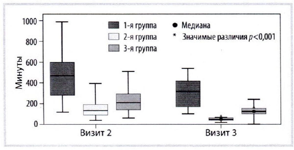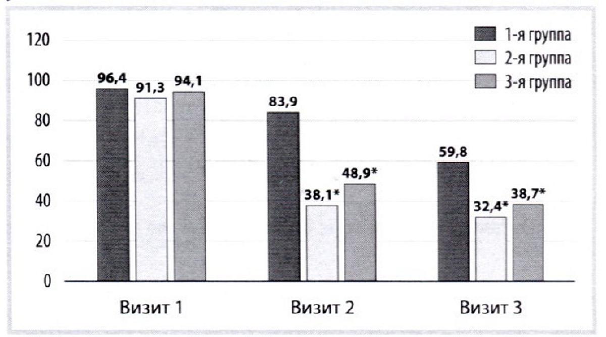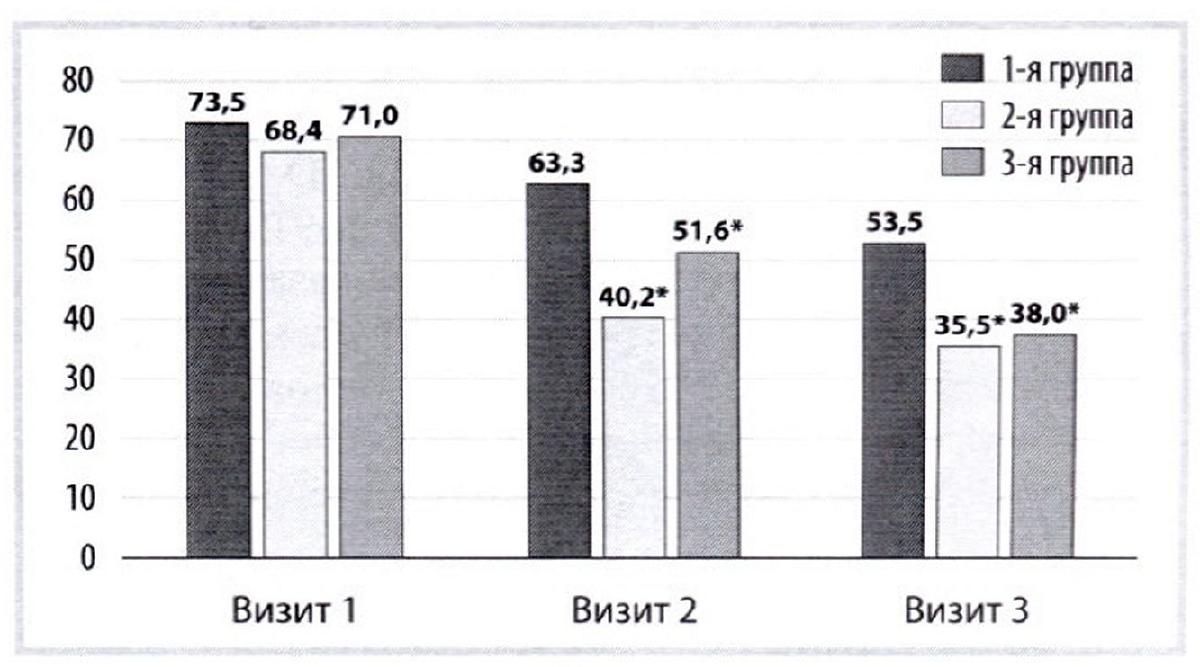Визит 2: 2-я группа vs 1-я группа: p<0,001; 3-я группа vs I -я группа: p<0,001; 3-я группа vs 2-я группа: p=0,005; визит 3: 2-я группа vs 1-я группа: p<0,001; 3-я группа vs 1-я группа: p<0,001; 3-я группа vs 2-я группа: p=0,002.