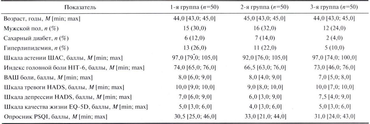 Note. Here and in Table 3; ВАШ — visual analogue scale; HADS - Hospital Anxiety and Depression Scale; HIT-6 — Headache Impact Questionnaire; PSQI — Pittsburgh Sleep Quality Index; ШАС — Scale of Asthenic Condition; EQ-5D — Quality of Life Assessment Scale.