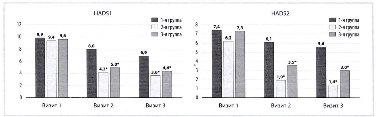 К визиту 3 индекс HIT-6 у пациентов 2-й группы снизился на 48,1%, 3-й группы — на 46,8%, 1-й группы — на 27,2%, что коррелируете результатами оценки по ВАШ (см. табл. 3). У пациентов 2-й и 3-й групп зафиксировано выраженное снижение баллов по шкале ВАШ от визита 1 к визиту 3: от 7,6±0,4 до 2,1 ±0,4 (2-я группа) и от 6,9±0,4 до 2,4±0,4 (3-я группа). В 1-й группе также фиксировалась положительная динамика, но в меньшей степени. Данные результаты коррелируют с показателями шкалы HADS (тревога/депрессия) (рис. 5). В 1-й группе выраженность тревожных расстройств снизилась на 30,3%, депрессивных — на 24,3%; во 2-й группе — на 61,7 и 77,4% соответственно, в 3-й группе — на 54,2 и 58,9% соответственно.