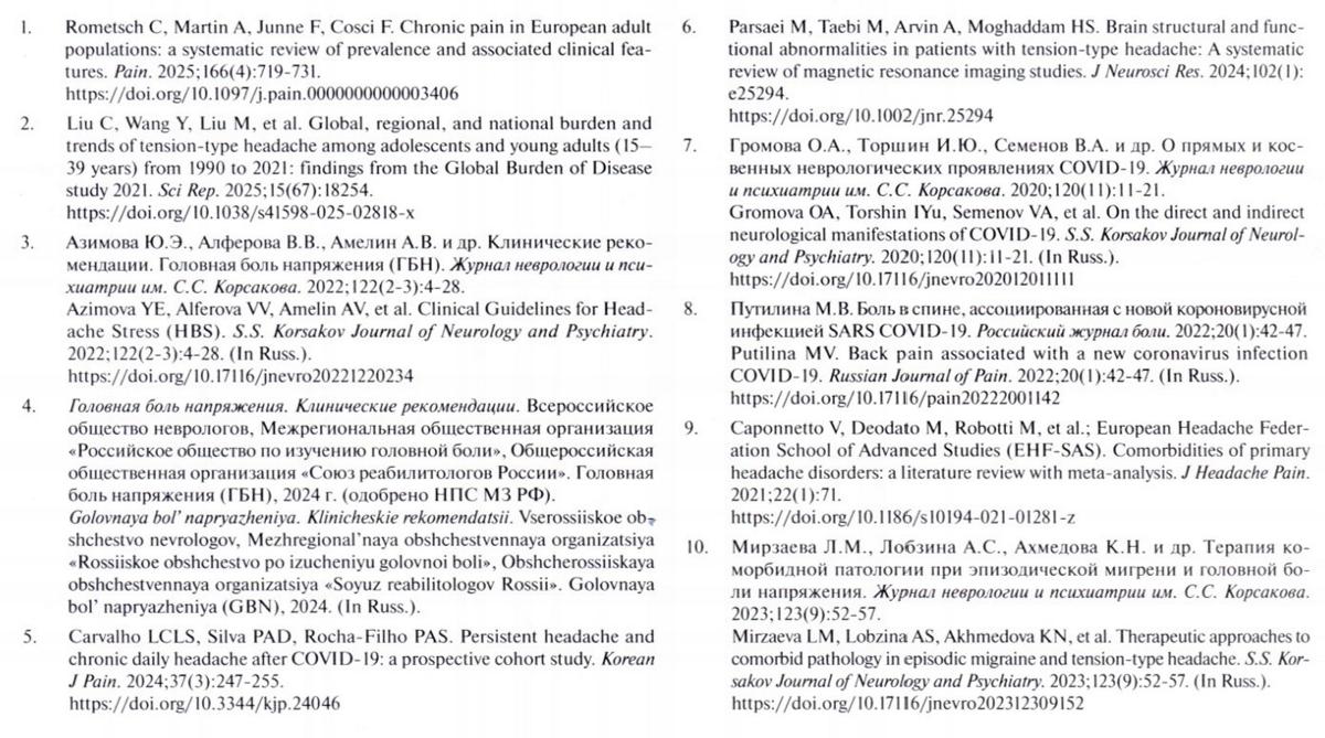 Хронические болевые синдромы (ХБС) — одна из актуальных проблем современной медицины [1]. Среди всех локализаций ХБС одно из лидирующих мест занимает головная боль напряжения (ГБН) [2]. ГБН характеризуется повторяющимися эпизодами головных болей (ГБ) легкой или средней интенсивности продолжительностью от 30 мин до нескольких суток [3]. Распространенность ГБН в общей популяции варьирует от 30 до 78% [3,4]. Глобальное бремя ГБН в период с 1990 по 2021 г. увеличилось на 38%, что позволило поставить ее на 3 место по распространенности болевых синдромов [2]. Новая коронавирусная инфекция также способствовала увеличению числа пациентов с ГБ [5—8], астенические, тревожно-депрессивные расстройства обнаружены у 25% пациентов с ГБН [9].