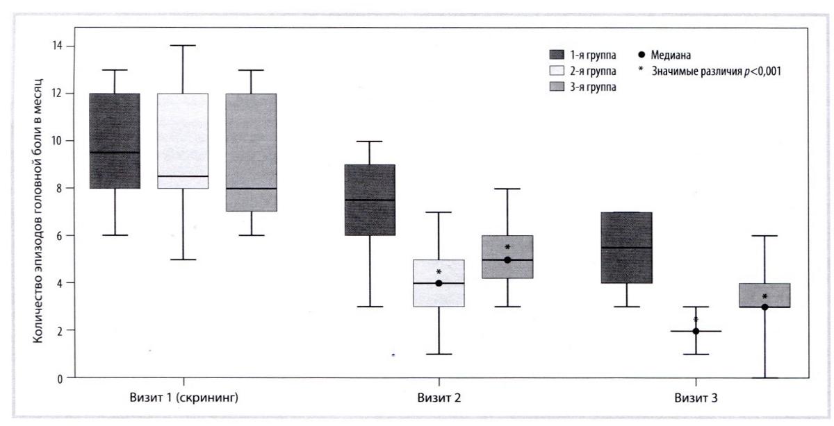 Позитивная тенденция изменения HIT-6 проявилась уже к визиту 2: в 1-й группе показатель уменьшился с 73,5±2,4 до 53,5±4,4 балла р<0,001), во 2-й группе — с 68,4±2,4 до 35,5±4,4 балла (/><0,001), в 3-й группе — с 71 ±5,2 до 38±3,4 балла (p<0,001) (рис. 4).