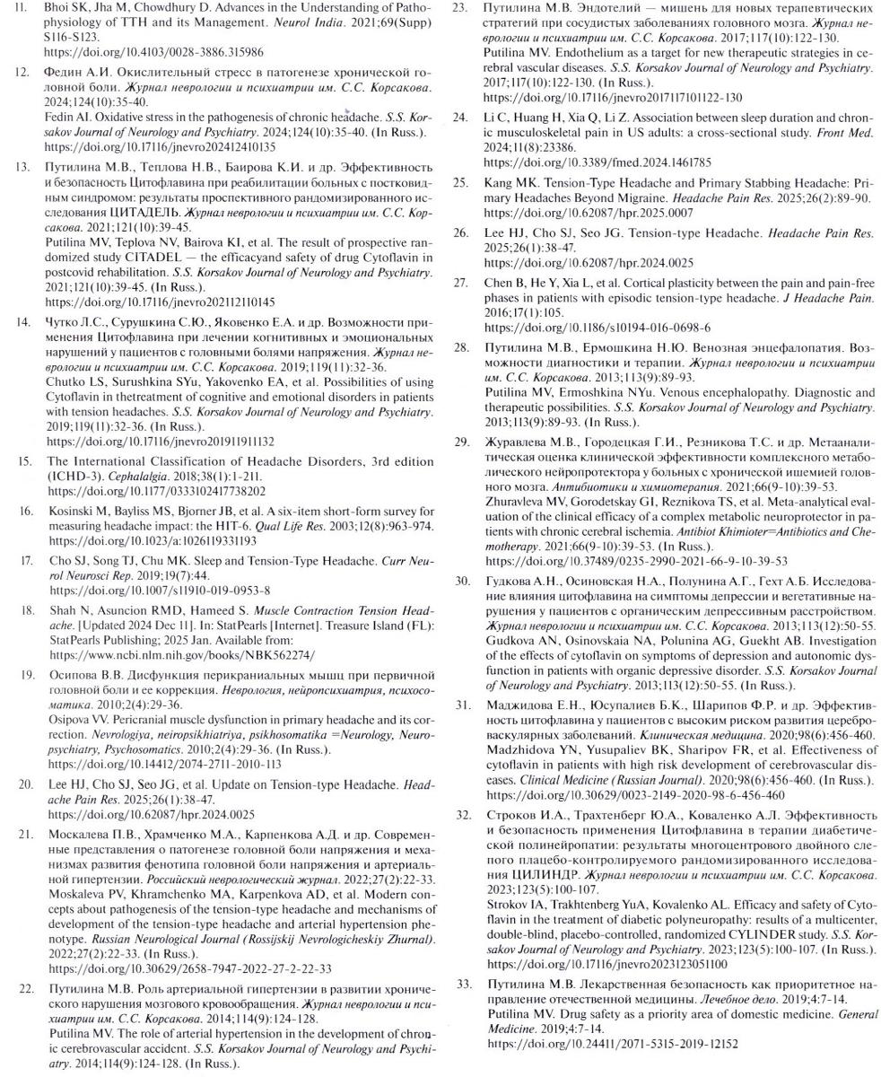 To cite this article: Putilina MV, Shabalina Nl, Blinova 1A. Results of the observational program CITOTREK (use of the drug CITOflavin in Tablets) in patients with tension headaches against the backgRound of asthenic syndromE taKing into account comorbidity. S.S. Korsakov Journal of Neurology and Psychiatry. 2025; 125( 10): 104—112. (In Russ.). doi.org/10.17H6/jnevro2025125l01104