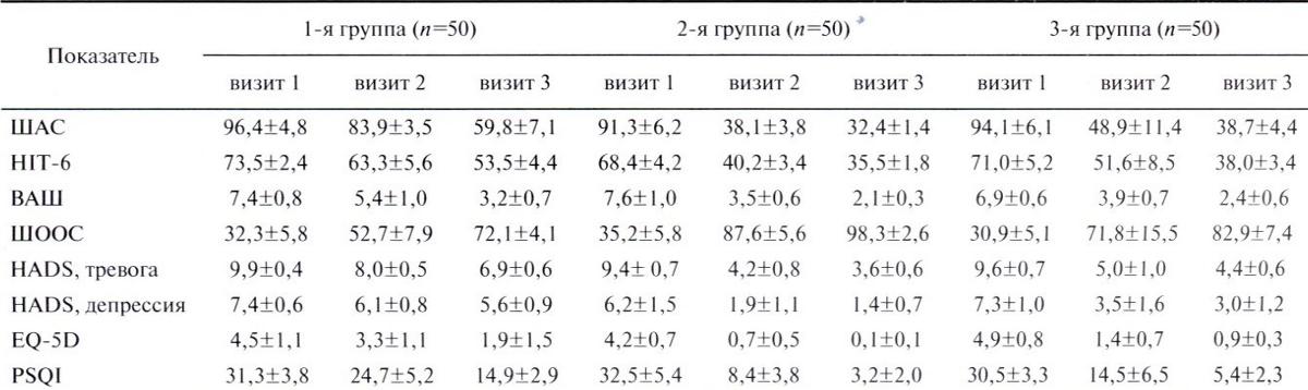Примечание. Здесь и в табл. 3: ВАШ — визуально-аналоговая шкала; HADS — госпитальная шкала тревоги и депрессии; HIT-6 — опросник влияния головной боли; PSQI — Питтсбургский опросник качества сна; ШАС — шкала астенического состояния; EQ-5D — шкала опенки качества жизни.