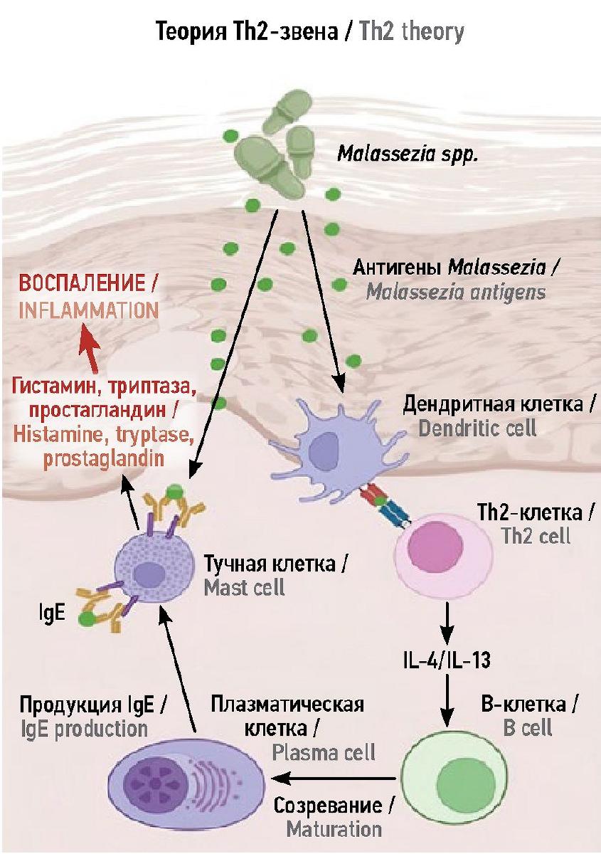 Первоначальное увеличение колонизации кожи дрожжевыми грибами рода Malassezia происходит в результате структурно-функциональной дисфункции эпидермального барьера и протекающего T2-воспалительного процесса, лежащих в основе АтД. При этом Malassezia spp. активируют врожденные и адаптивные иммунные реакции посредством выделения своих продуктов жизнедеятельности (метаболиты и антигены Mala s 11, Mala s 13, являющиеся потенциальными аллергенами для пациентов с АтД), которые способствуют формированию сенсибилизации к ним организма хозяина c развитием комбинированной гиперчувствительности I и IV типов, участию Th2- и Th17-имунных реакций, усугубляющих симптомы основного заболевания, в том числе через иммунный ответ, опосредованный иммуноглобулином (Ig) E. Более того, определена роль белка M. globosa (MGL_1304) и его гомологов из M. sympodialis (Mala s 8) и M. restricta (Mala r 8), проявляющих различную активность в отношении тучных клеток и их медиаторов — гистамина и триптазы, провоцирующих зуд и воспаление в себорейных зонах кожного покрова при АтД, что указывает на их непосредственное участие в патогенезе варианта АтД с преимущественным вовлечением головы и шеи [9]. Не менее интересны данные наблюдений, указывающие на то, что антигены Malassezia spp. также обнаруживаются в поте, где они выступают в качестве дополнительного провоцирующего фактора для развития обострения заболевания в условиях повышенного потоотделения [10].