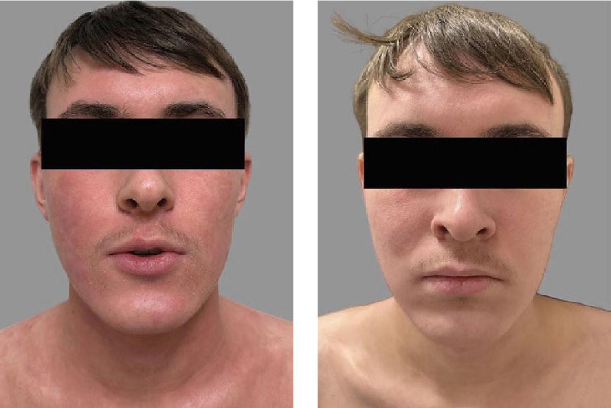 Рис. 5. Разрешение парадоксальной эритемы головы и шеи, ассоциированной с дупилумабом, на фоне смены терапии на ингибитор янус-киназы и использования топических препаратов активированного пиритиона цинка у пациента 17 лет.