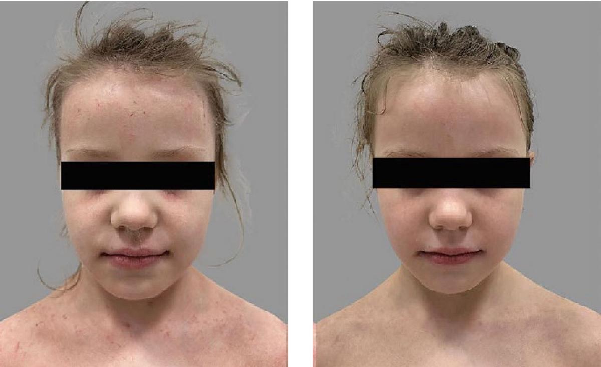 Пациентка, 12 лет, длительно страдала АтД среднетяжелого течения (EASI — 13,6 балла) с рецидивирующими высыпаниями в области головы и шеи независимо от сезона года. Симптомов других аллергических заболеваний не выявлено, семейный анамнез атопическими заболеваниями не отягощен. Пациентка отмечала ухудшение высыпаний после физической активности и повышения потоотделения, жаловалась на выраженный зуд. Родители отмечали необходимость ношения девочкой маек и водолазок, позволяющих ей закрывать смущающие ее высыпания в области верхней части туловища и шеи. Ребенок тревожный, имел трудности с засыпанием, частые пробуждения, в том числе в связи с ночным чувством зуда указанных локализаций, включая волосистую часть головы, где наблюдались множественные экскориации, воспалительная эритема и мелкопластинчатое шелушение. Длительно используемые в чувствительных зонах монокомпонентные тГКС высокой активности в форме крема не имели значительного эффекта.