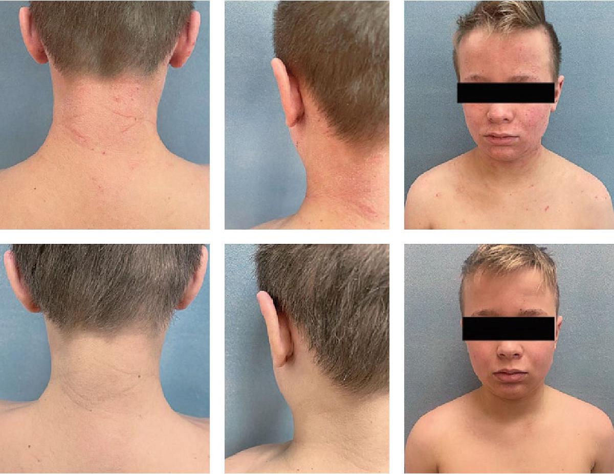 Рис. 4. Положительная динамика в виде регресса воспалительных высыпаний и уменьшения проявлений лихенификации кожи в области головы и шеи на фоне назначения препаратов с активированным пиритионом цинка у пациента 14 лет с атопическим дерматитом и сезонным аллергическим ринитом.