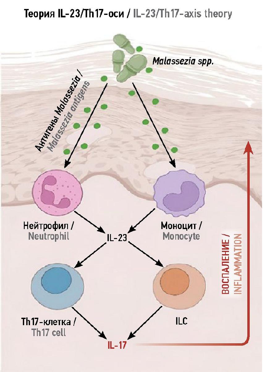 Однако есть еще одна механистическая теория, объясняющая формирование персистирующих экзематозных высыпаний на коже в области головы и шеи, колонизированной Malassezia spp. В ее основе лежит активация воспалительной оси IL-23/Th17. В рамках этой точки зрения антигены Malassezia spp. способствуют высвобождению провоспалительного цитокина IL-23 нейтрофилами или моноцитами, что приводит к последующей активации Th17-клеток и врожденных лимфоидных клеток, впоследствии секретирующих IL-17, связанный с развитием не только экзематозных, но и псориазиформных высыпаний, а также с нарушением регуляции противогрибкового ответа [19].
