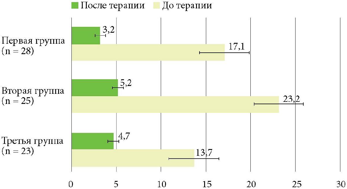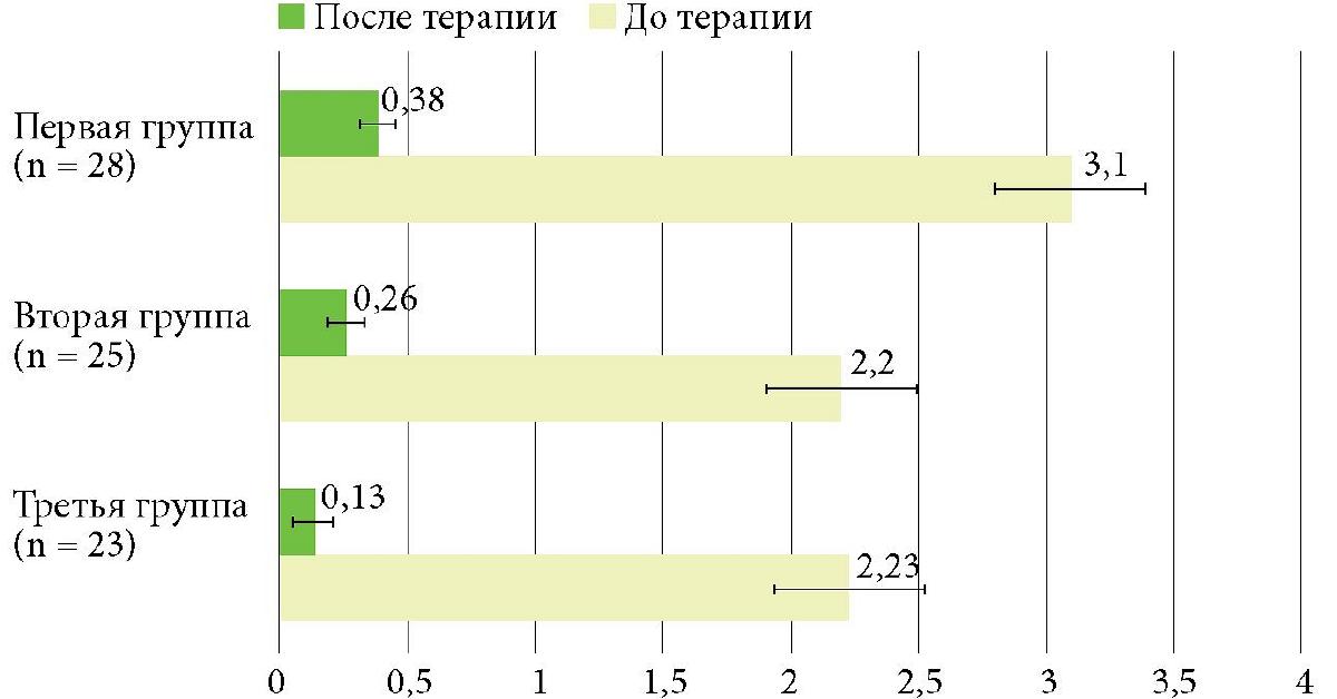 Значение DLQI у пациентов второй группы с локализацией СД на коже лица (с использованием крема) до начала лечения составило 23,2 ± 4,7 балла (p < 0,05), индекс SDASI - 2,2 ± 1,86 (p < 0,05). Результаты опроса свидетельствовали о чрезвычайно сильном влиянии СД на качество жизни пациентов. У пациентов третьей группы (использовали аэрозоль) ввиду локализации процесса на закрытых участках кожного покрова результаты были несколько ниже - 13,7 ± 3,3 балла (p < 0,05), но также существенно сказывались на качестве жизни. Индекс SDASI у пациентов третьей группы составил 2,23 ± 1,12 балла (p < 0,05).