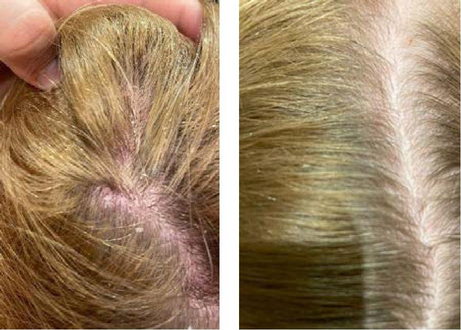 Первую группу составили 28 пациентов. Очаги СД были локализованы исключительно на коже ВЧГ и ретроаурикулярной области, при этом сыпь имела скорее лихеноидную форму с выраженным мелкопластинчатым шелушением. Пациенты данной группы применяли только шампунь с АЦП в составе в качестве монотерапии три раза в неделю в течение двух недель (рис. 1).