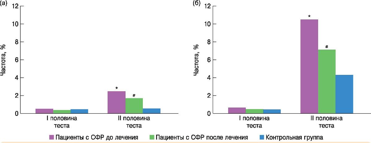По данным психофизиологического обследования, проведенного с помощью TOVA, выявлено отсутствие статистически достоверных различий показателей у пациентов с СФР по сравнению с контрольной группой в I половине теста и статистически достоверное увеличение показателей невнимательности (р < 0,05) и импульсивности во II половине теста (р < 0,05) в основной группе по сравнению с контрольной (рисунок).
