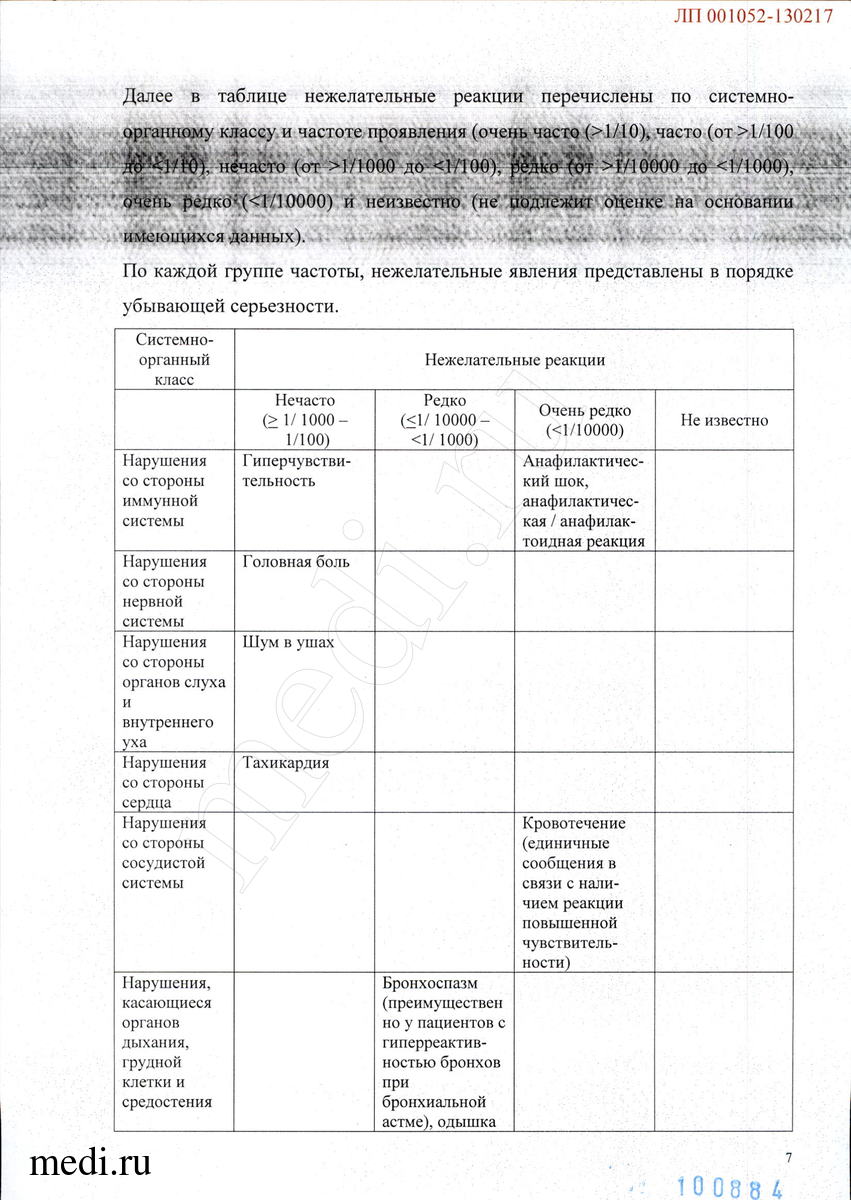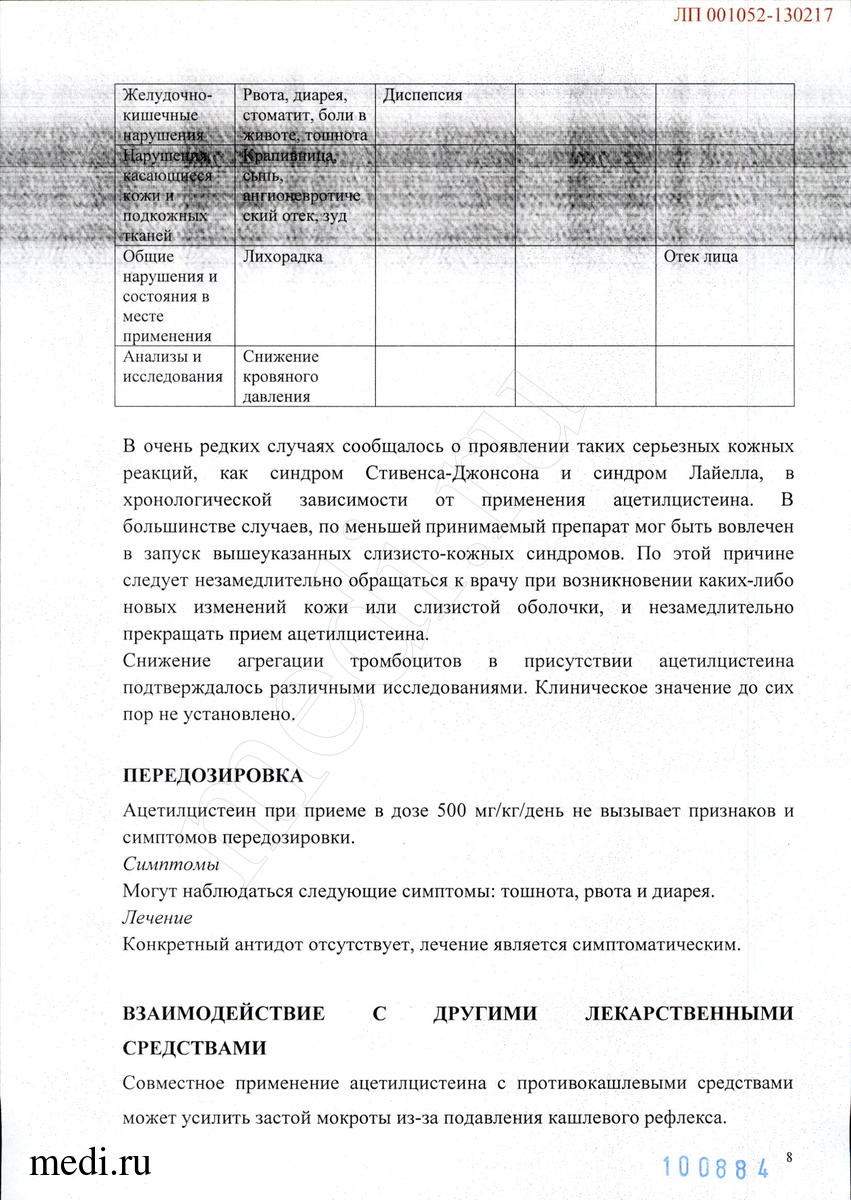 В редких случаях возможны: тошнота, изжога, ощущение переполнения желудка, рвота, диарея, кожная сыпь, зуд, крапивница, носовые кровотечения, шум в ушах. При приеме ацетилцистеина описаны случаи развития бронхоспазма, коллапса, стоматита, снижения агрегации тромбоцитов.