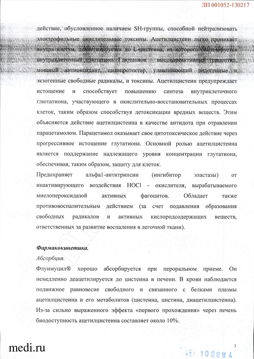 Флуимуцил® хорошо абсорбируется при пероральном приеме. Он немедленно деацетилируется до цистеина в печени. В крови наблюдается подвижное равновесие свободного и связанного с белками плазмы ацетилцистеина и его метаболитов (цистеина, цистина, диацетилцистеина). Из-за высокого эффекта «первого прохождения» через печень биодоступность ацетилцистеина составляет около 10%. Ацетилцистеин проникает в межклеточное пространство, преимущественно распределяется в печени, почках, легких, бронхиальном секрете.