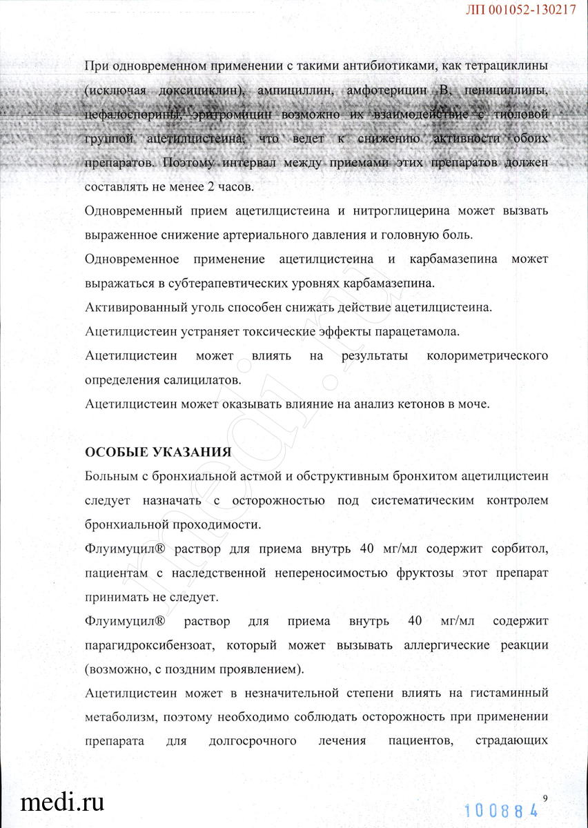 При одновременном применении с такими антибиотиками, как тетрациклины (исключая доксициклин), ампициллин, амфотерицин В, возможно их взаимодействие с тиоловой группой ацетилцистеина, что ведет к снижению активности обоих препаратов. Поэтому интервал между приемами этих препаратов должен составлять не менее 2 часов.