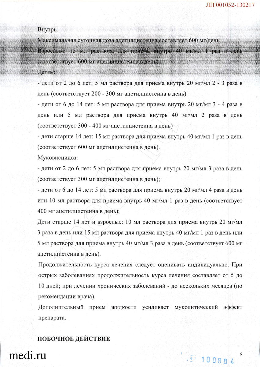 - дети от 6 до 14 лет: 5 мл раствора для приема внутрь 20 мг/мл 3-4 раза в день или 4 мл раствора для приема внутрь 40 мг/мл 2 раза в день (соответствует 300 - 400 мг ацетилцистеина в день)