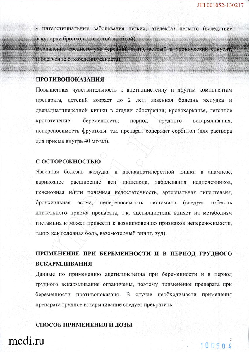 Повышенная чувствительность к ацетилцистеину и другим компонентам препарата, детский возраст до 2 лет; язвенная болезнь желудка и двенадцатиперстной кишки в стадии обострения, период лактации.