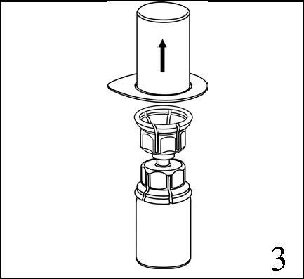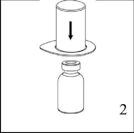 4. Поместите на ровную поверхность флакон с препаратом, и переверните над ним флакон с растворителем вместе с прикрепленным к нему устройством Mix2Vial, затем стержнем прозрачной части устройства для добавления растворителя проткните пробку флакона с препаратом, надавливая вертикально вниз. Растворитель автоматически переместится во флакон с препаратом. |