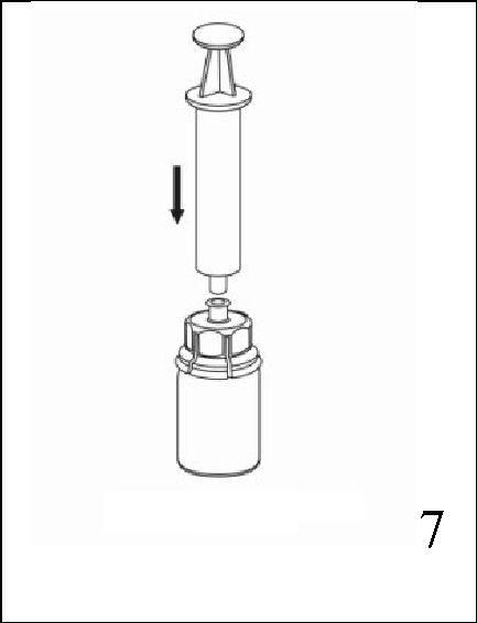 8. Нажимая на поршень шприца, переверните флакон вместе со шприцем. Плавно оттягивая поршень шприца, наберите в него восстановленный раствор. |