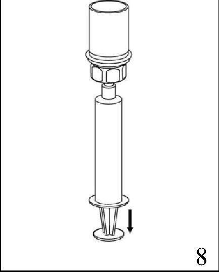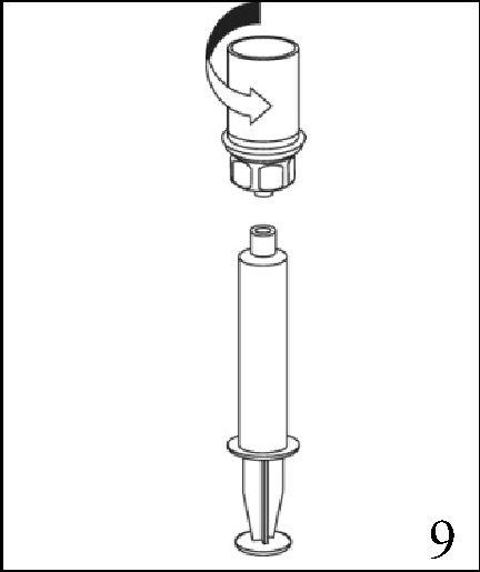 9. После того, как восстановленный раствор набран в шприц, обхватите цилиндр шприца (удерживая шприц вниз поршнем) и отсоедините прозрачное устройство Mix2Vial от шприца. |