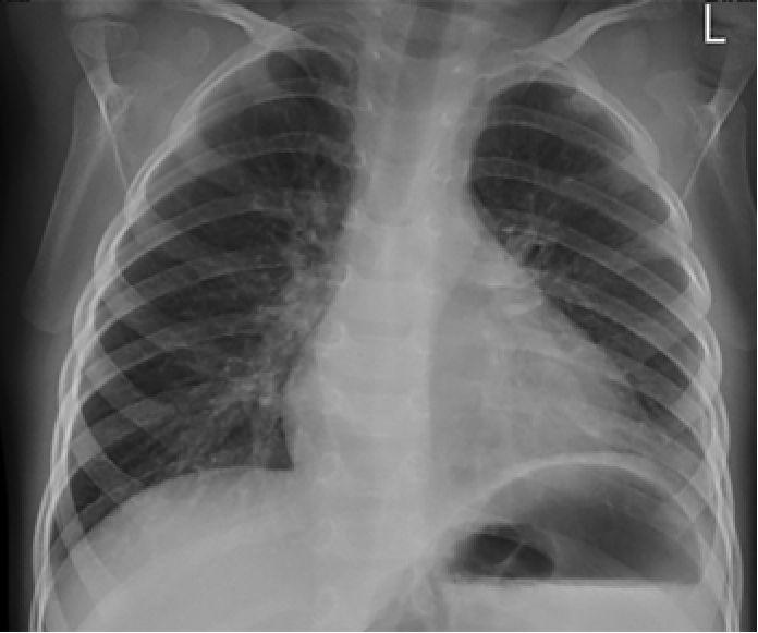Рис. 1. Рентгенограмма органов грудной клетки в прямой проекции мальчика Б. на третий день болезни. Левосторонняя нижнедолевая пневмония, левосторонний гидроторакс минимального объема