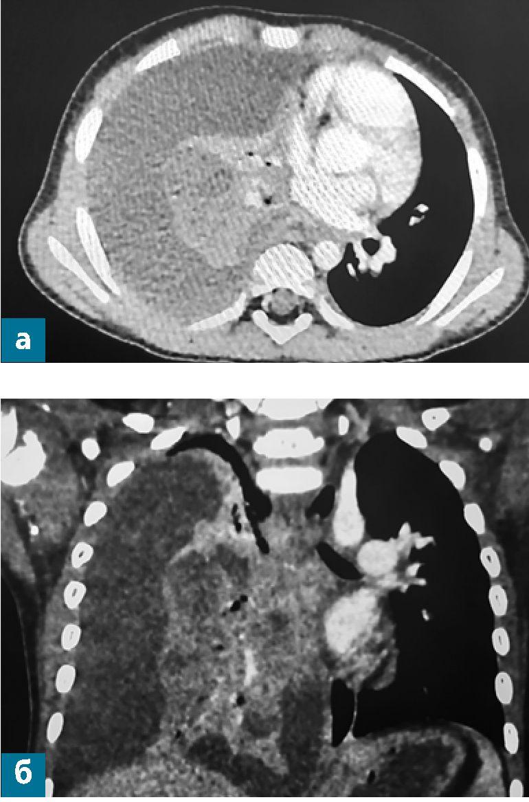 Рис. 5 (а, б).Компьютерные томограммы органов грудной клетки мальчика М. на десятый день болезни в аксиальной и фронтальной плоскостях с контрастным усилением.
