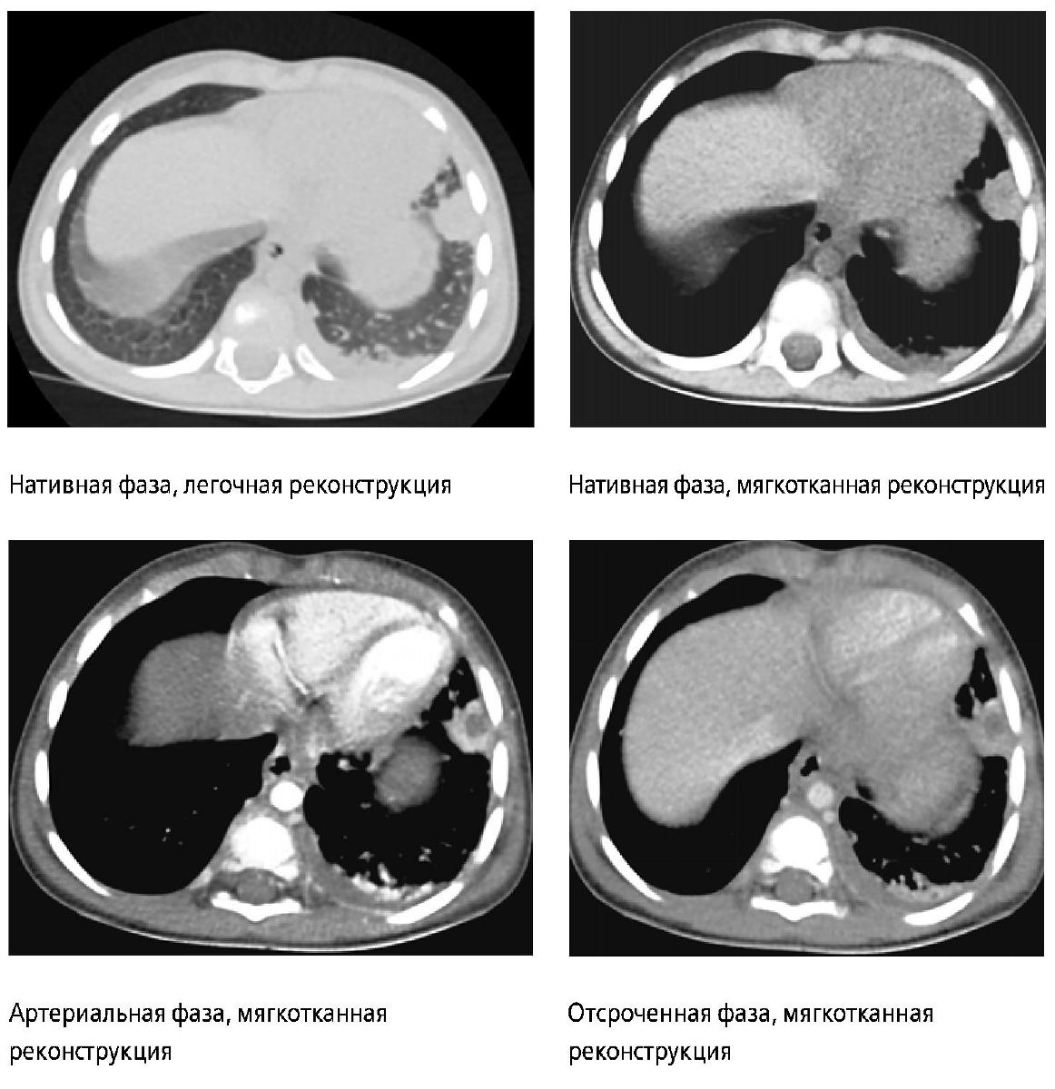 Результаты ультразвукового исследования по существу подтвердились после получения данных компьютерной томографии органов грудной клетки с контрастным усилением, проведенной на следующий день (рис. 3).