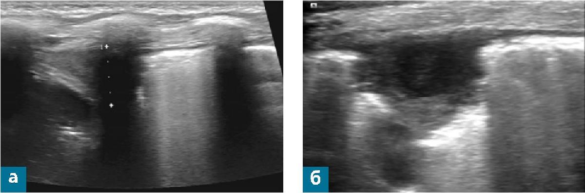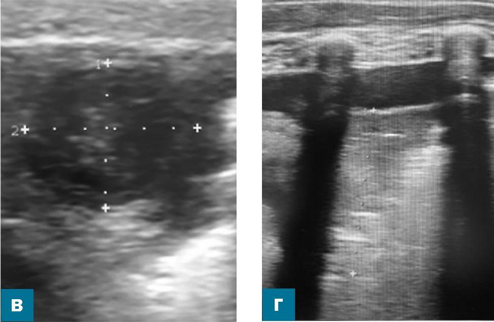 - В составе определяется отграниченная полость диаметром до 10 мм с утолщенными до 1,2 мм стенками, с неоднородным жидкостным содержимым за счет гиперэхогенных линейных включений (рис. 2 б, в).