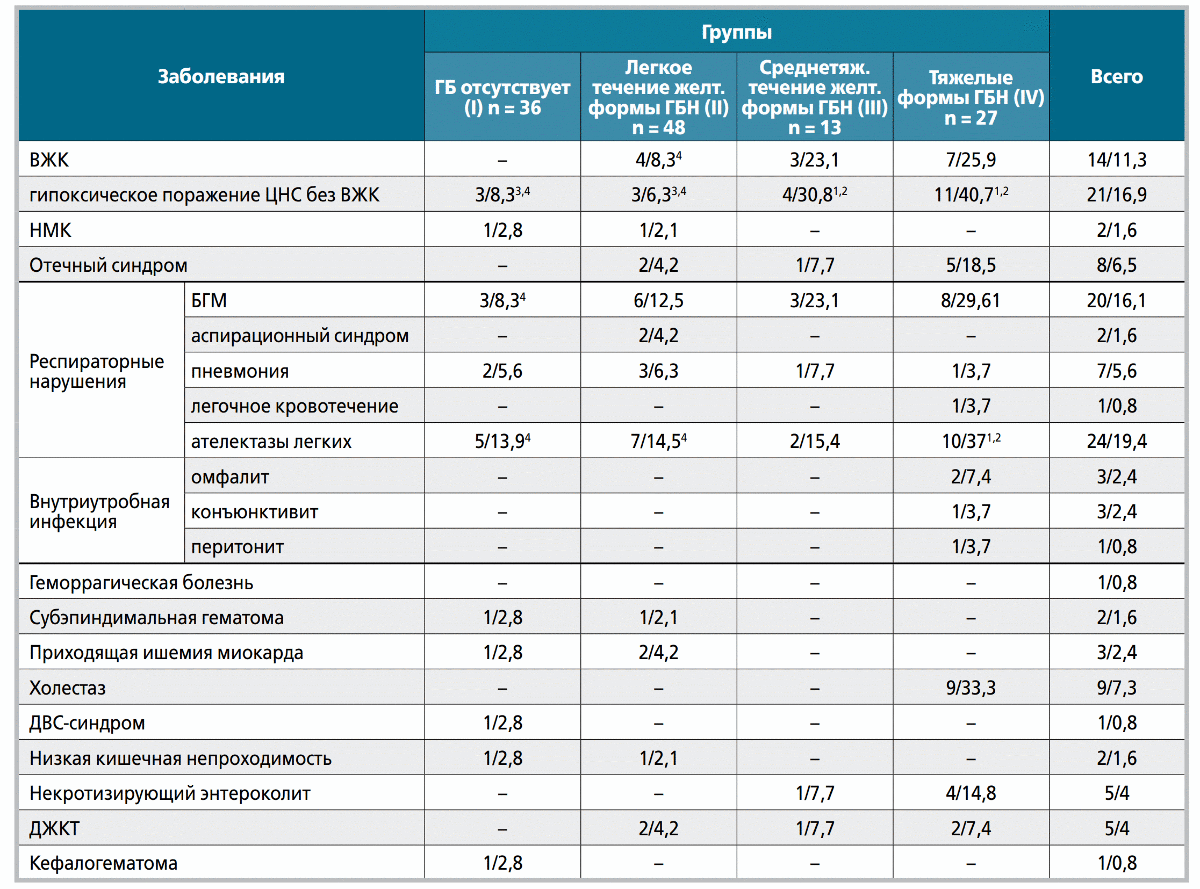 Анализ состояния детей по группам показал, что вследствие недоношенности у детей с тяжелыми формами ГБ (IV группа) и среднетяжелым течением желтушной формы заболевания (III группа) чаще (р < 0,05), чем у новорожденных с легким течением (II) или без признаков ГБ (I), диагностировано гипоксическое поражение ЦНС без ВЖК (40,7%; 30,8%; 6,3% и 8,3%). ВЖК II-IV степени чаще выявлялись в IV группе, чем в I: 25,9% и 8,3% (р = 0,04). Ателектазы легких реже диагностированы в I и II группах, чем в IV: 13,9%, 14,5% и 37% соответственно (р < 0,05). БГМ реже определялась в I группе, чем в IV: 8,3% и 29,6% (р < 0,05).