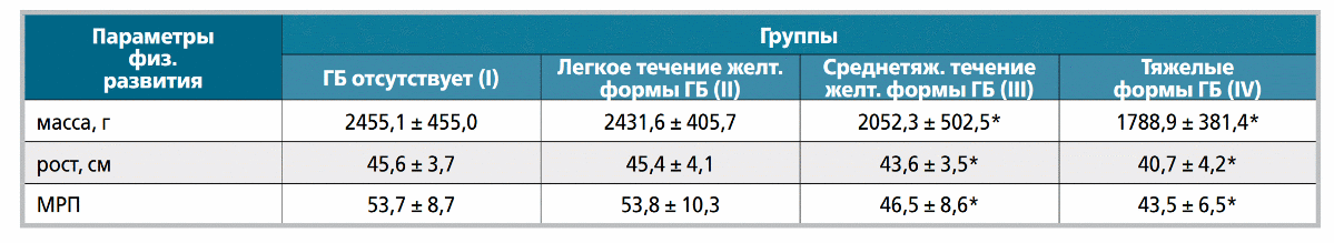 Таблица 5. Показатели клинического и биохимического анализов крови у детей с ГБ при рождении (n = 124)