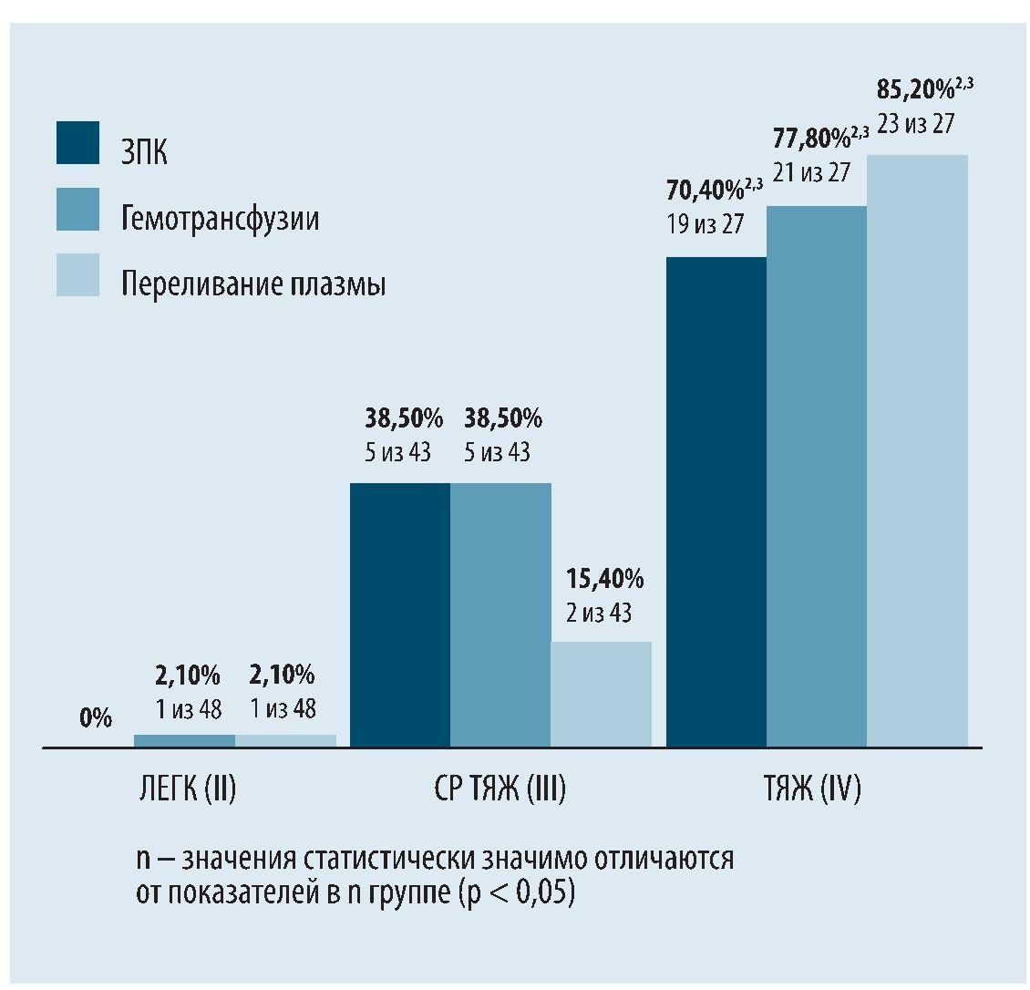 Рис. 1. Частота ЗПК, гемотрансфузий и переливания плазмы у новорожденных с ГБ