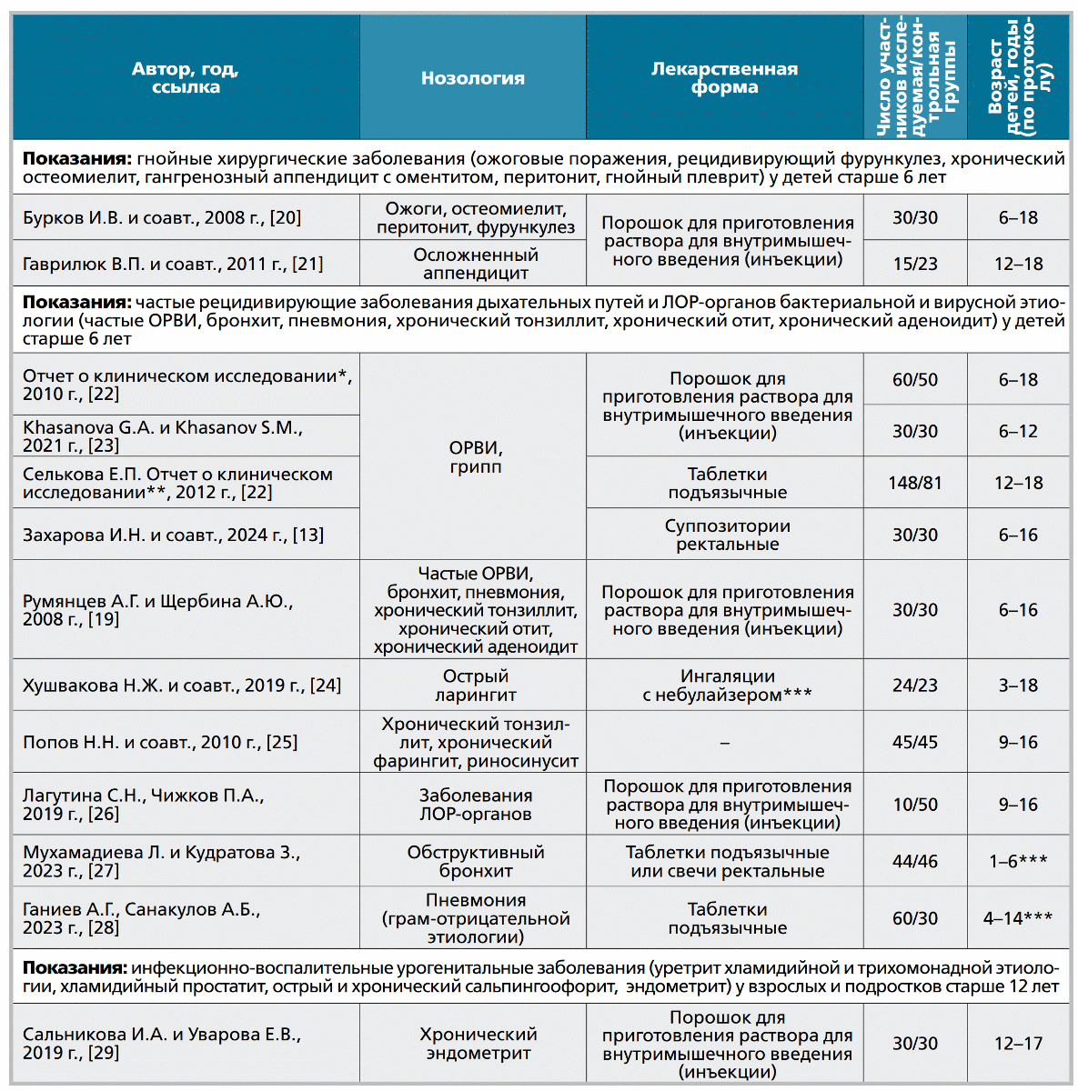Резюме педиатрических исследований препарата представлено в таблице; во всех исследованиях получены доказательства его эффективности при широком спектре инфекционно-воспалительных заболеваний.