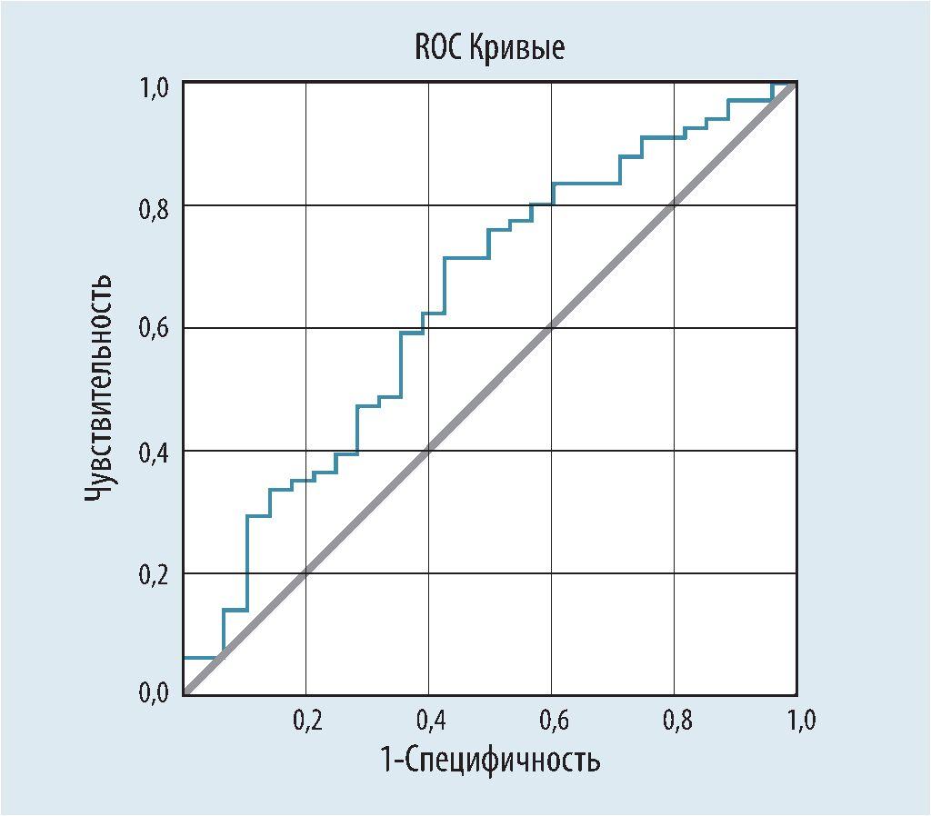 Статистическую обработку полученных данных проводили с помощью программы STATISTICA 10.0 (StatSoft Inc., США) с применением непараметрических методов. Количественные показатели, распределение которых отличалось от нормального, представляли в виде медианы, первого и третьего квартилей (Ме [Q1; Q3]). Для сравнения количественных показателей двух выборок использовали U-критерий Манна - Уитни, для сравнения трех и более групп -критерий Краскела - Уоллиса. Номинальные данные описывали с указанием абсолютных значений и процентных долей. Сравнение номинальных данных проводили с помощью критерия х2 Пирсона и точного критерия Фишера. Для сравнения групп по частоте бинарного признака вычисляли отношение шансов (ОШ) с указанием 95% доверительного интервала (95% ДИ) [24]. Разницу между показателями считали статистически значимой при р < 0,05. Для оценки связи между группами рассчитывали коэффициент корреляции (r) Спирмена. Для построения прогностических моделей применялся ROC-анализ.