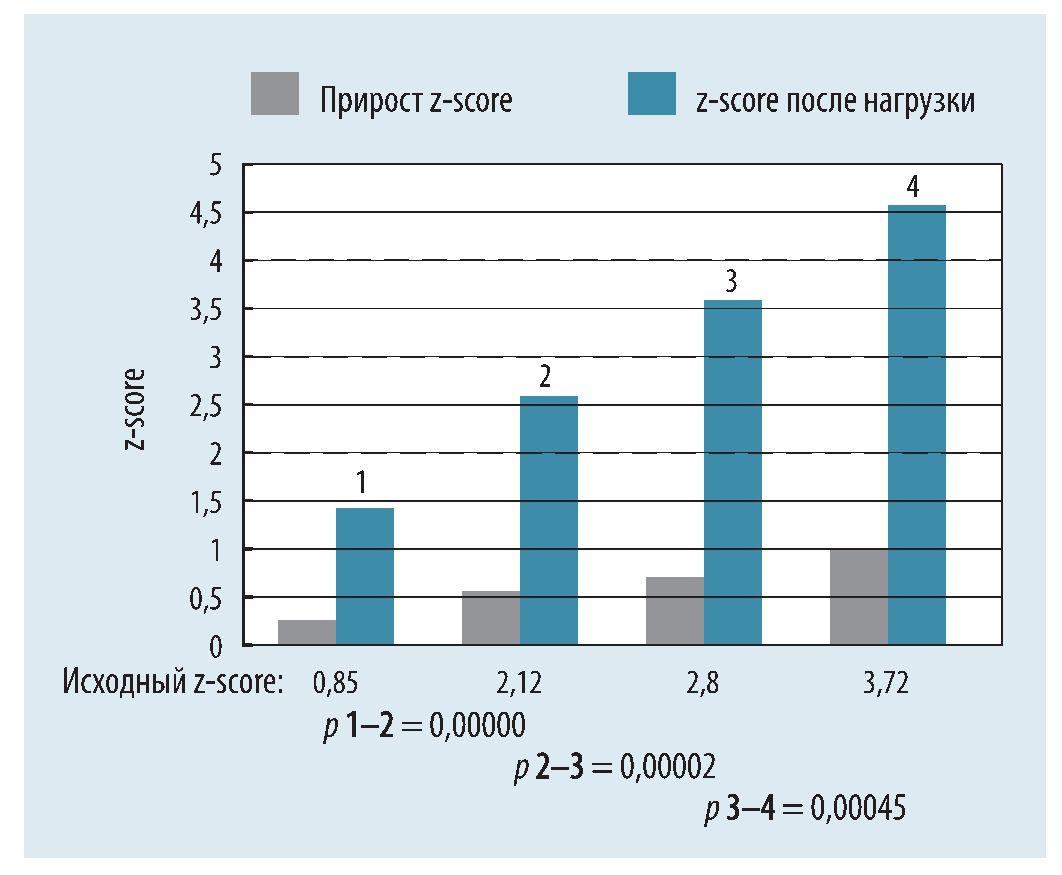 Z-score после нагрузки | 1,43 [0,14; 1,7] | 2,59 [2,43; 2,74] | 3,78 [3,48; 4,3] | p 0-1 <0,002 |